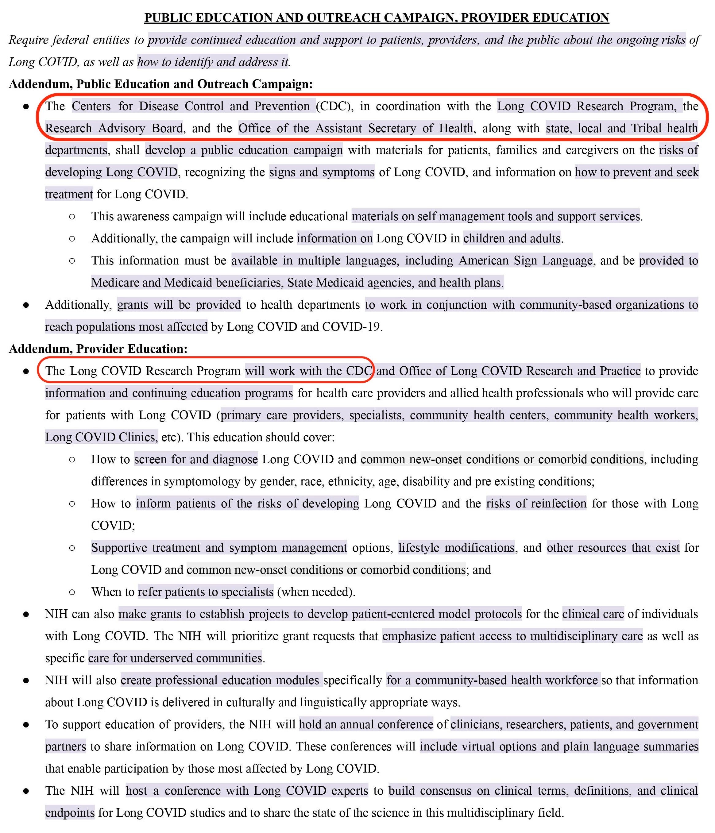 As previously discussed, the CDC has lost all trust from the Long COVID community. Given that the CDC Director is nicknamed “Maskless Mandy” and “Mass Murder Mandy,” and #CDCKills may be one of the only bipartisan hashtags out there, it’s safe to say the Long COVID community is not going to back any proposal that relies on the CDC in any way. The CDC has contributed to the genocide of the American people, and this proposal is a $10B shovel disguised as “education.”