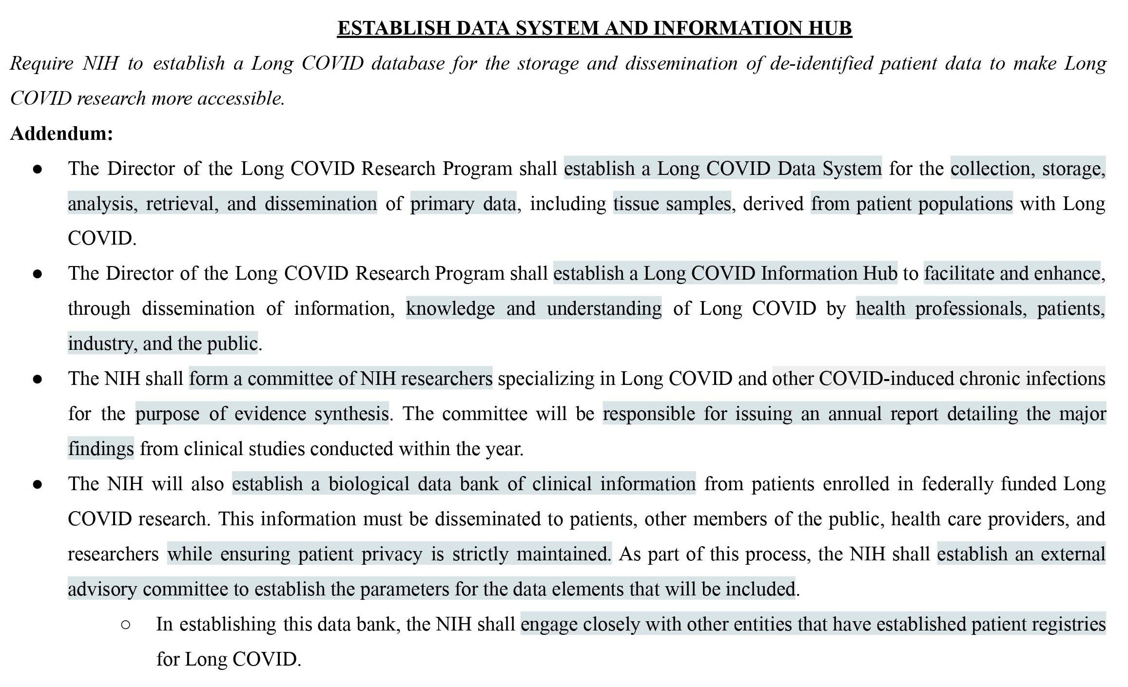The federal government already uses patient data however they see fit, with or without our permission. They don’t need to allocate additional research funding to do this. Unlike patients with HIV or, in some states, those with mental health diagnoses, patients with Long COVID have no option to opt-out of this type of de-identified database once they receive medical care. This includes vaccination, reporting COVID test results, accessing acute care treatment, and other care. NIH also uses medical records to train AI on how to “identify” Long COVID. (Be realistic - medical providers don’t even recognize it).